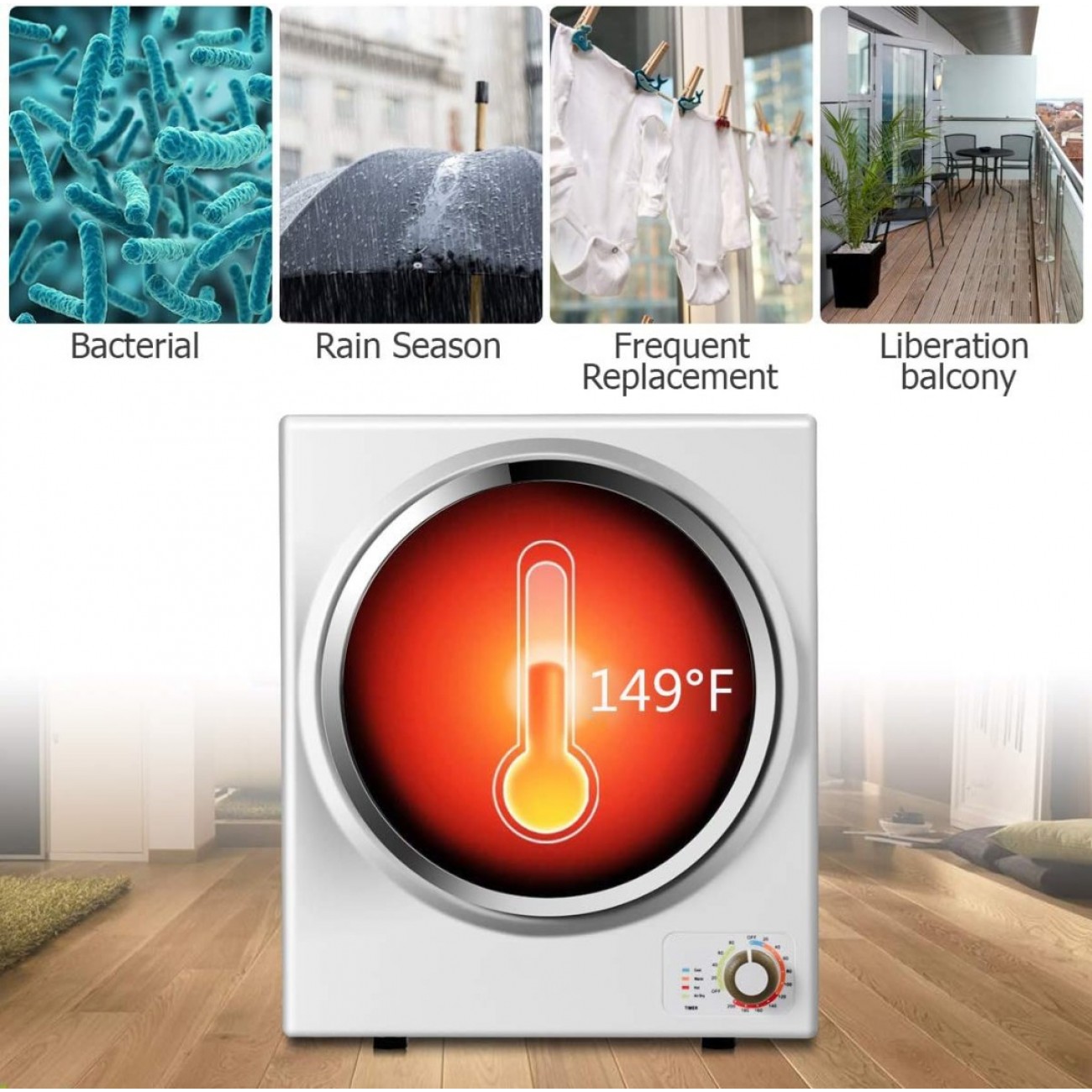 - 【Multifunction】According to the material and weight of the cloth, you can set the time length or different mode for drying: Cool(0-20mins): cool down the temperature, Warm(30-120mins): dry and cool cloth, Anti-wrinkle, Hot (120-200min): for drying large quantities or bulky item, Air dry(0-80mins) run with cool air to freshening.