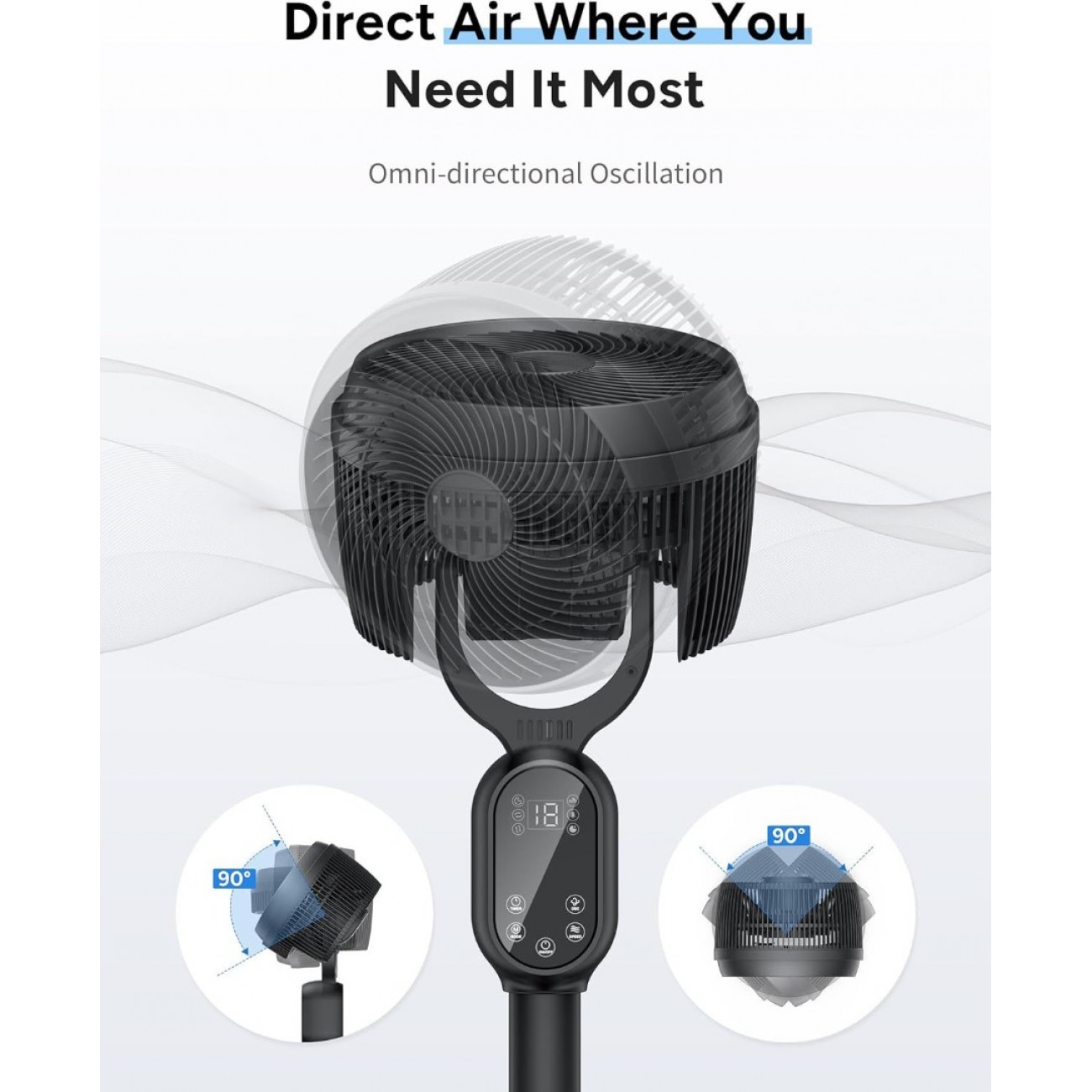 - Oscillating fan with remote : Can oscillate horizontally and vertically simultaneously for up to 90˚, while having an adjustable pedestal, helping you deliver fresh air more efficiently, while also having an easy to clean design.