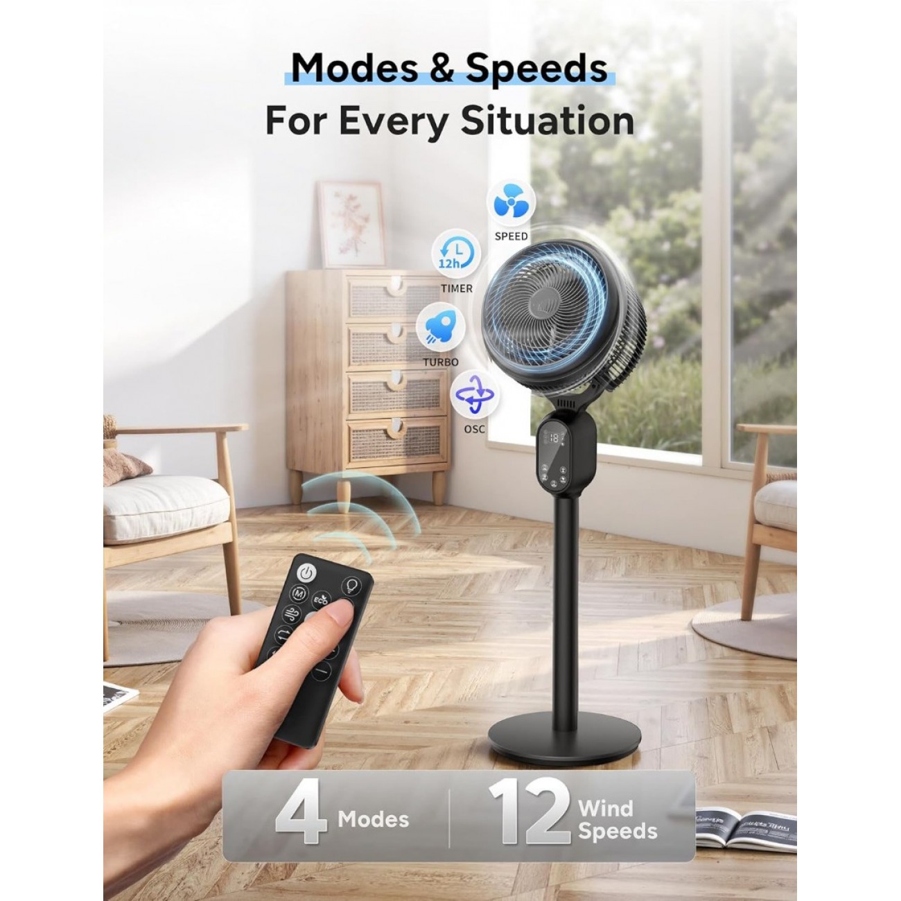 - All the fans you need in one: Fan is not only floor fan, but also a circulatior fan and has multiple functions.This fan for bedroom is the ultimate air comfort solution, adding extra features to perfect your usage experience.12 unique wind speeds and 4 powerful modes adapt to every single one of your needs.
